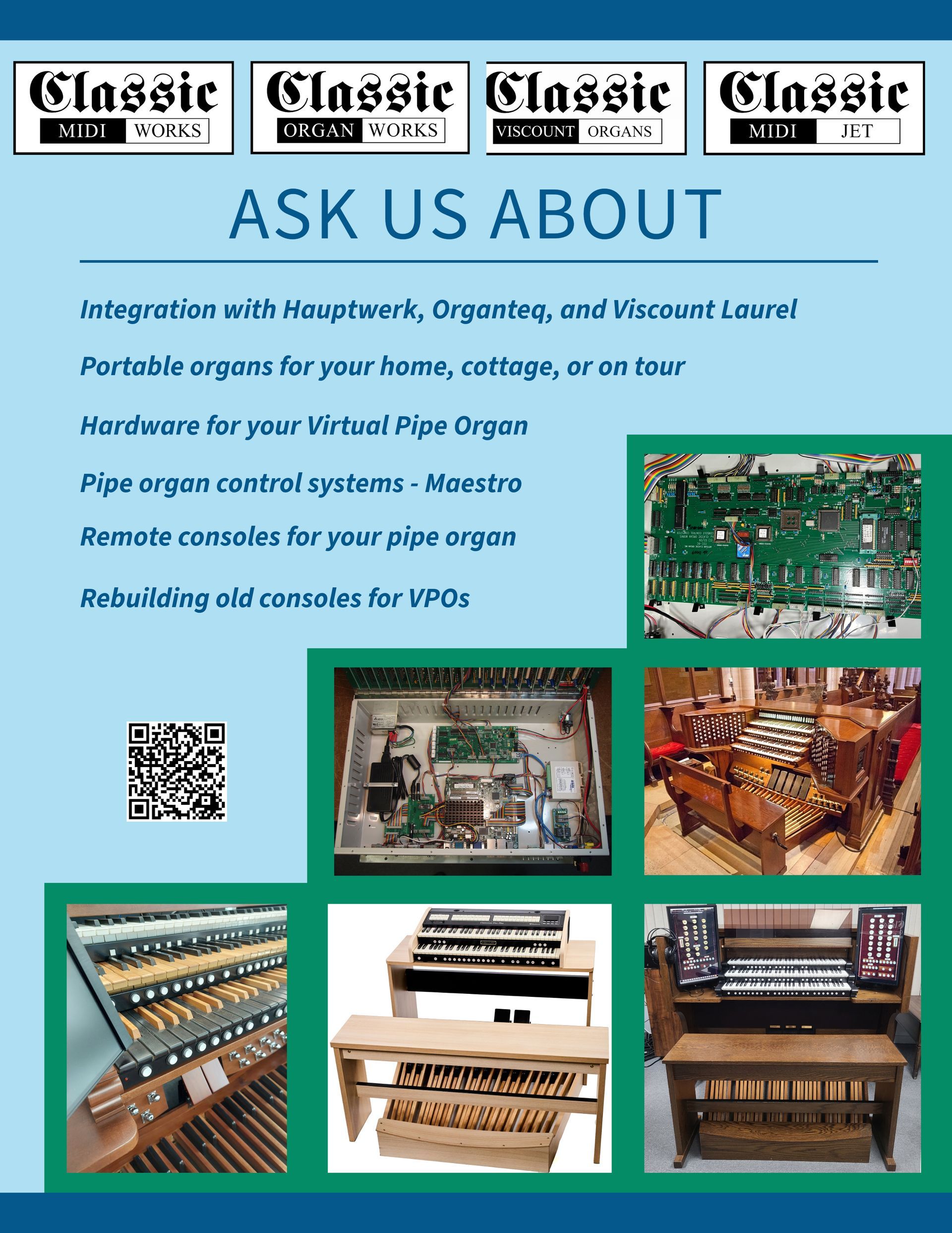On February 24, 1976 Henry Wemekamp took what had been a couple miscellaneous projects for a friend and established The Classic Organ Company Ltd, a new company building control systems for pipe organs, one of the first companies worldwide to develop micro-processor technology for classical organs. In the late 1980's Classic again led the way by being one of the first companies to develop digital-sampled tone-generation technology that permitted note-by-note regulation, similar to that possible with organ pipes. In 1990 Henry was again first on the market when he débuted the Console Control Computer a single computer board which not only functions as the brains for an organ's entire control system, but had fully integrated MIDI support. An updated version of this computer is still available today. As computer technology and the internet continued to grow and advance, Classic followed suit, and in 2013 shipped its first Maestro System. Maestro is a Linux based control system which allows authorized people, such as the organist and builder, to access the system over the internet.